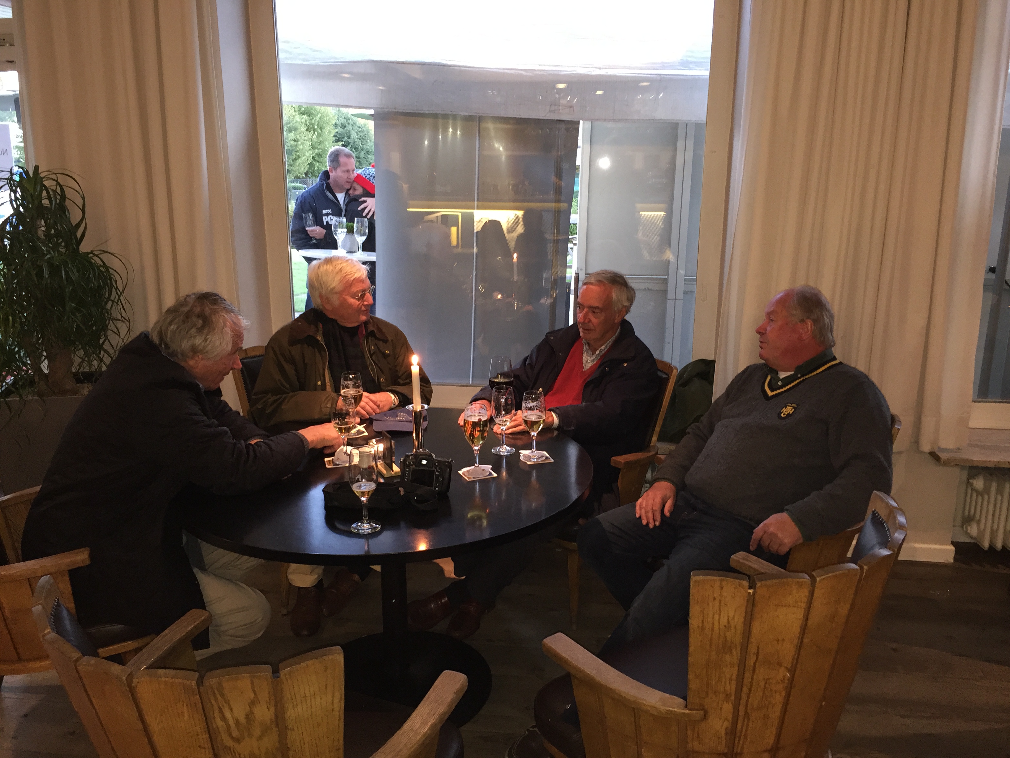Pünktlich zum ersten Abschlag regnet es in Strömen, durch den Sturm peitscht das Wasser waagerecht in die furchtlosen Gesichter. Bis auf vier Pappnasen, die langsam aufweichen würden und sich daher in das Restaurant zurückziehen, marschiert die Truppe los – es ist ja auch Turnier!